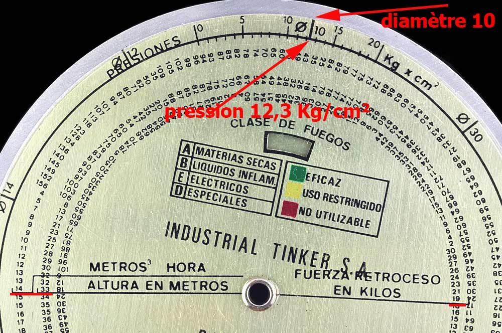 Pour une lance d'un diamètre de 10 avec une pression de l'eau de 12,3 Kg/cm² le calculateur nous indique:Un débit de 14 m³/ heure, une hauteur max de 33 m et une force de recul de la lance de 19 Kg